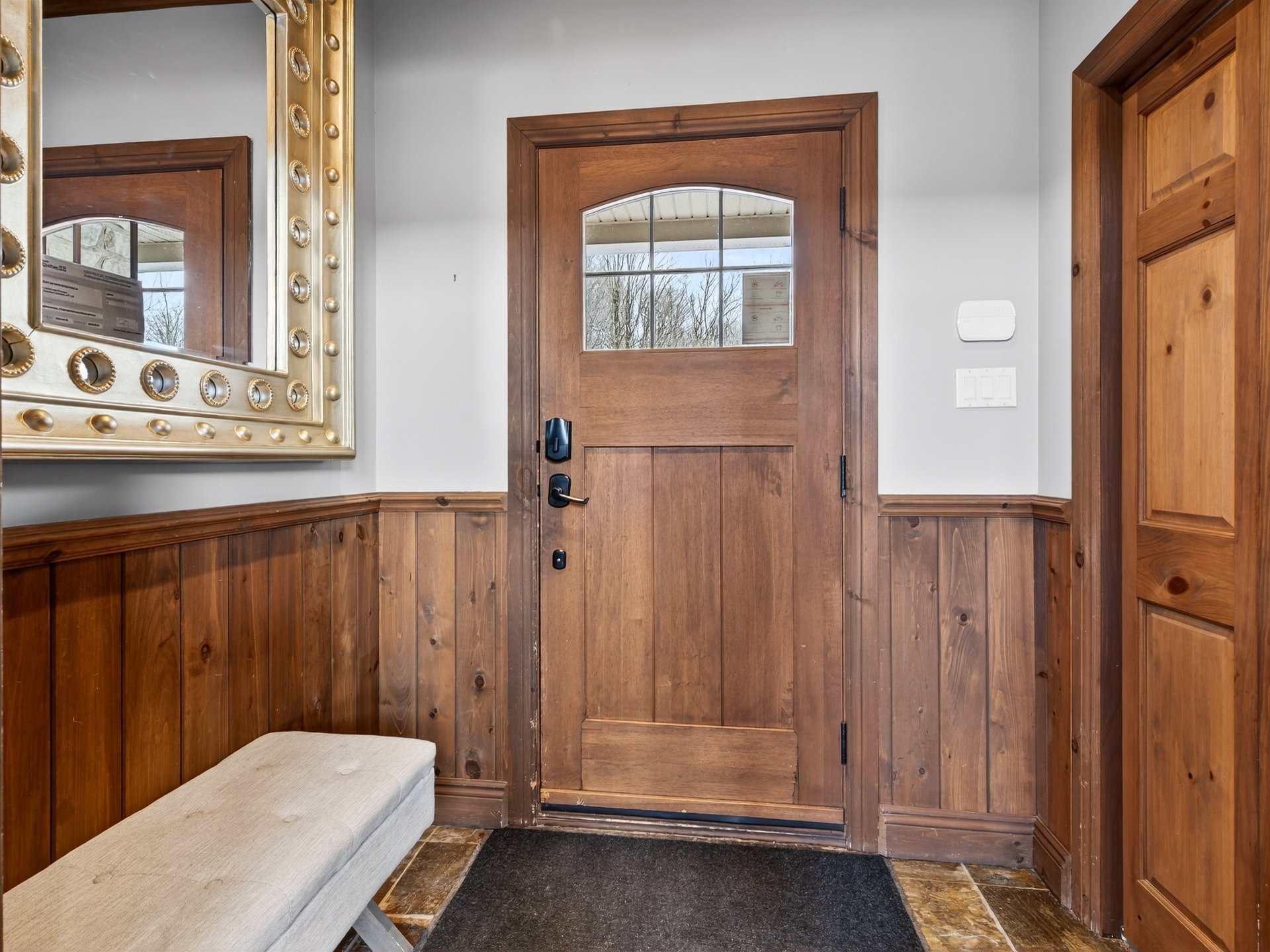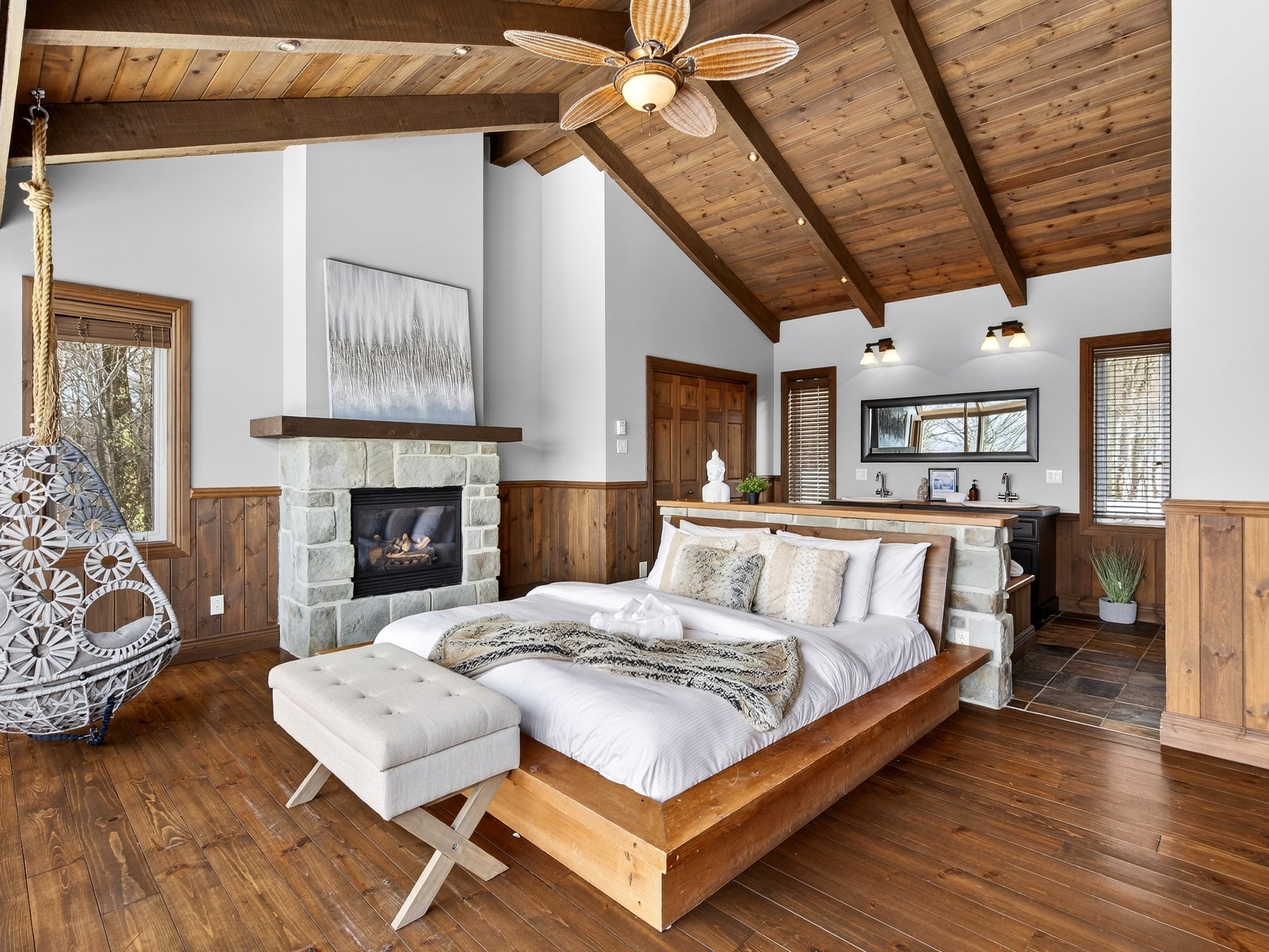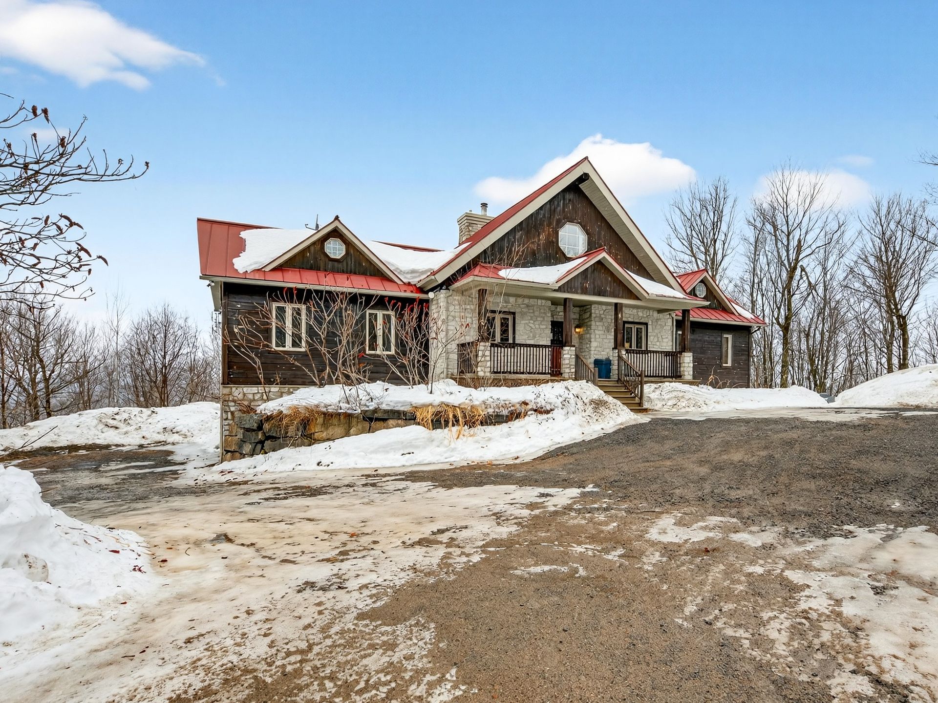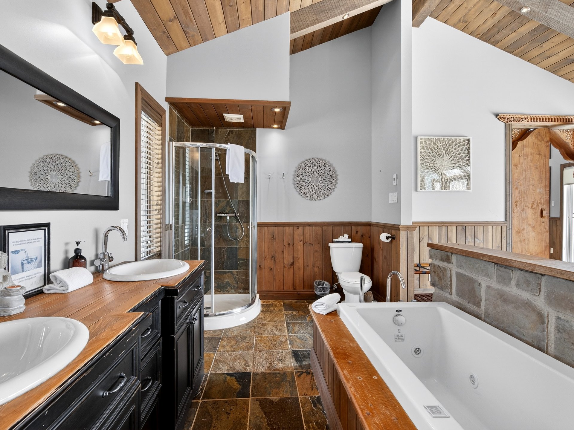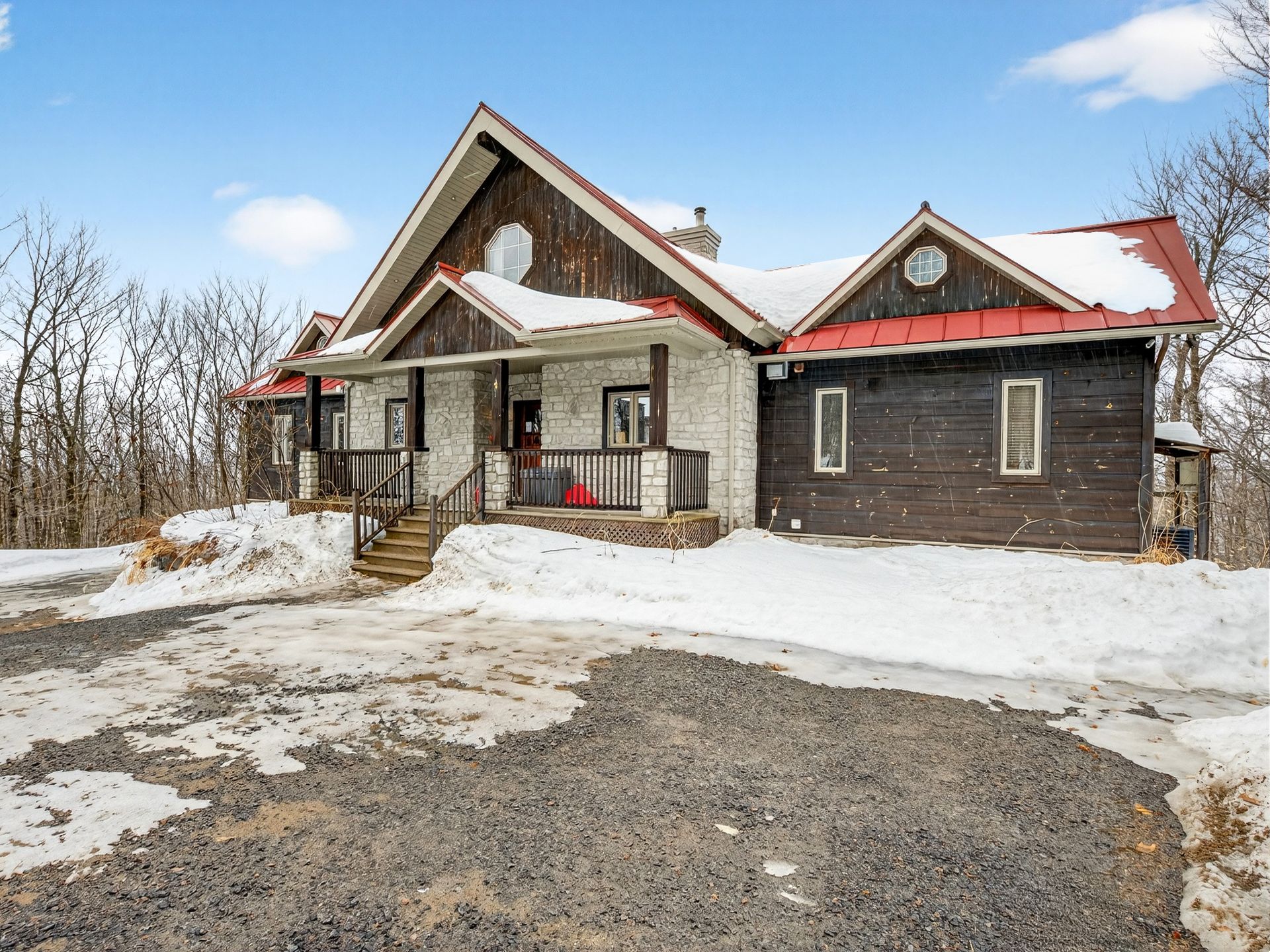 rustique, avec un revêtement extérieur en pierre et en bois