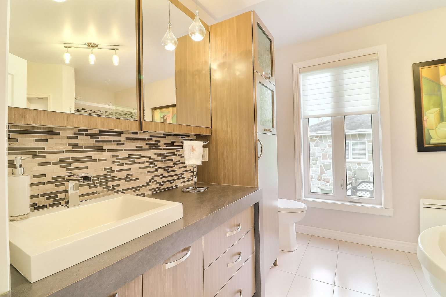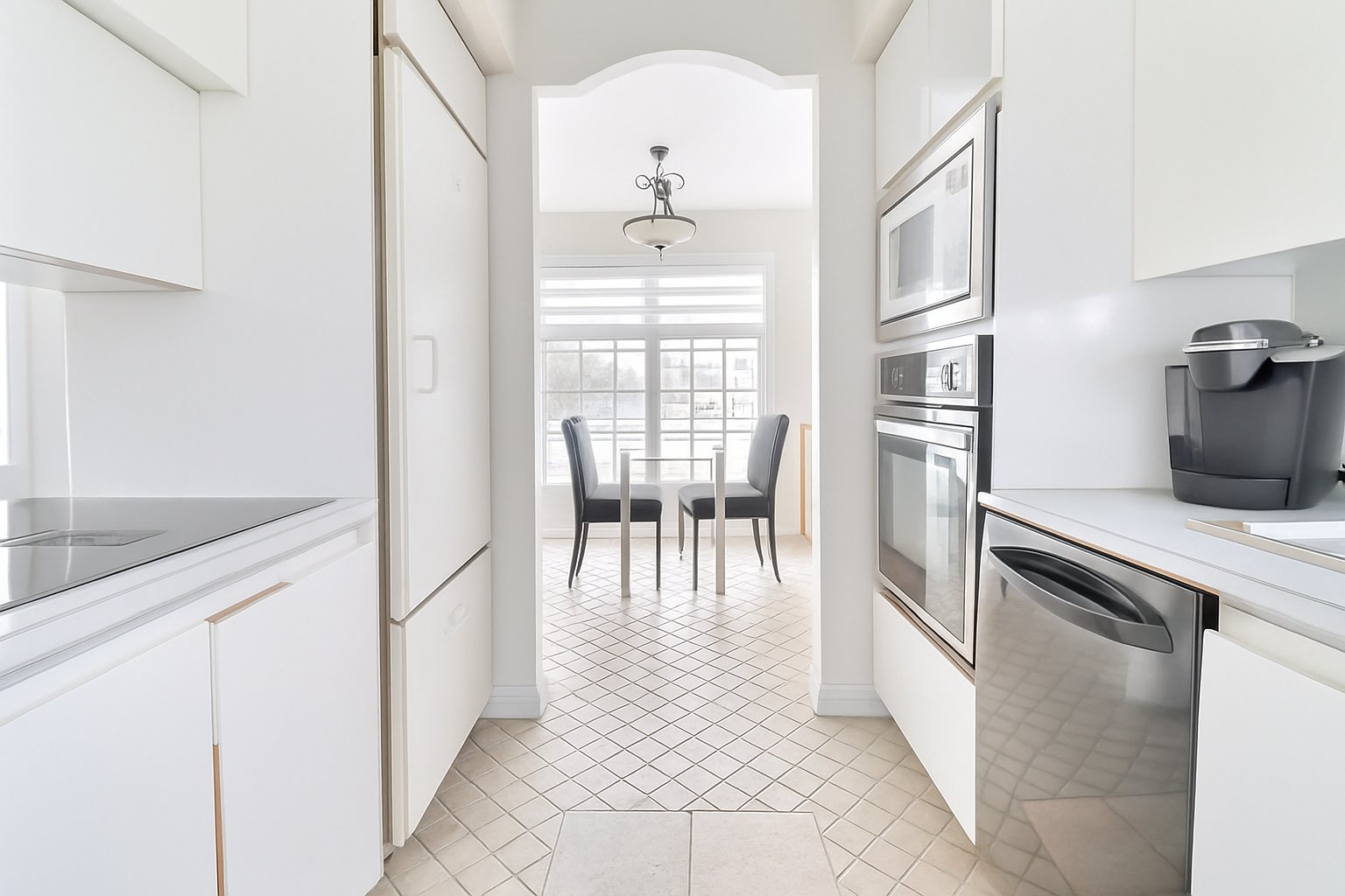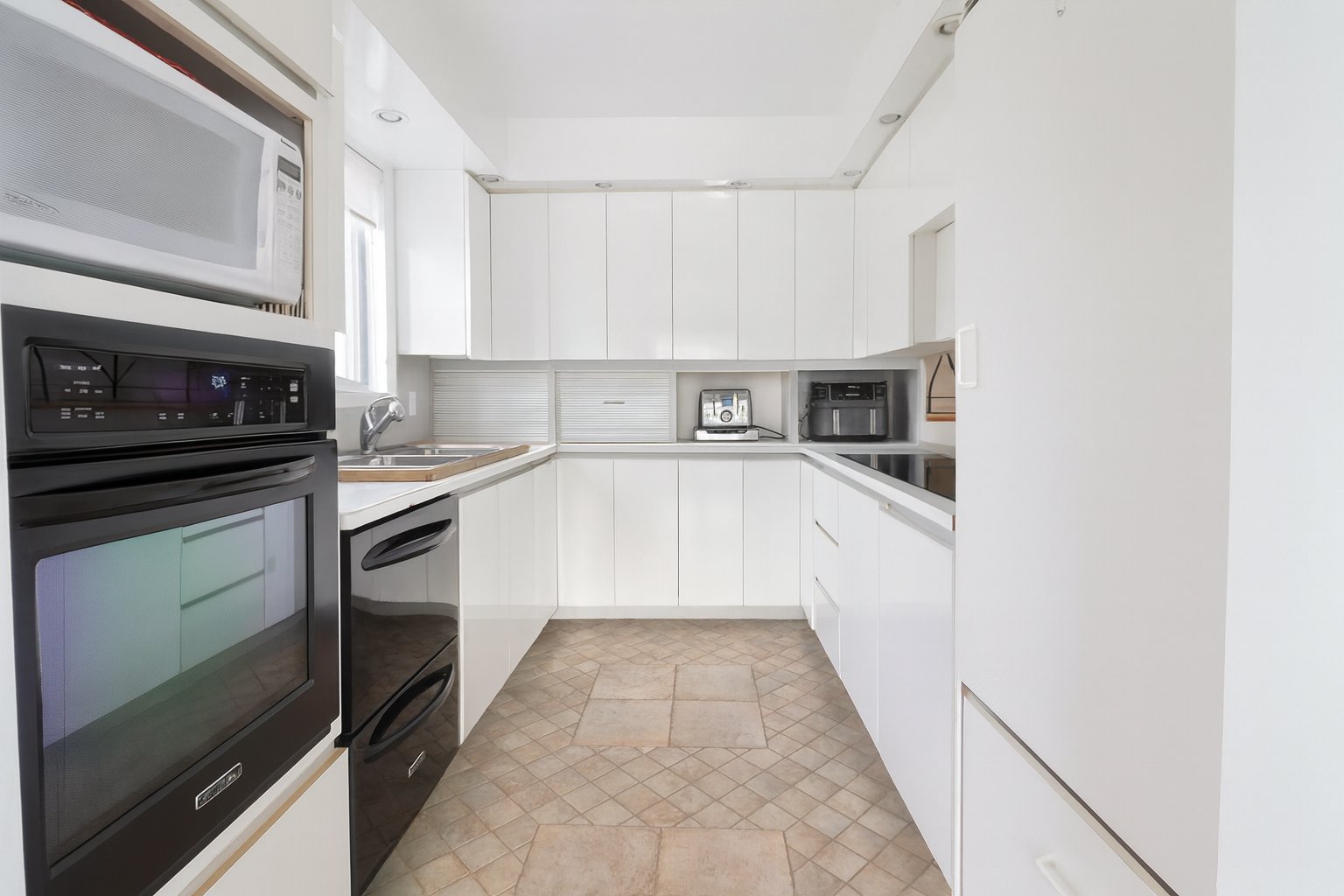 Stores, luminaires, plaque chauffante, four encastré, lave-vaisselle, réfrigérateur Sub-Zero, laveuse et sécheuse.